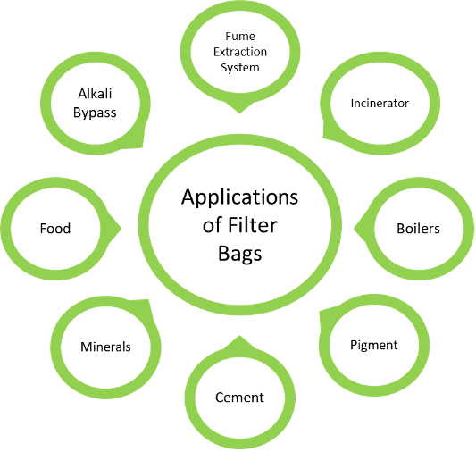 There is wide variety of filter fabrics used in pulsejet bag filter like Polyester, Polypropylene, Acrylic, PTFE, Aramid, Ryton, Glass-fibre, and Ceramics. There are various special type of coatings applied on these filter fabrics depending on application. If the temperatures up to 260°C, then the glass fibre bags are best suitable. Various application demands filter fabrics suitable for oily, moist, explosive, or fine particle air separation. Hence, selecting filter fabrics plays crucial role in performance of bag filter.
